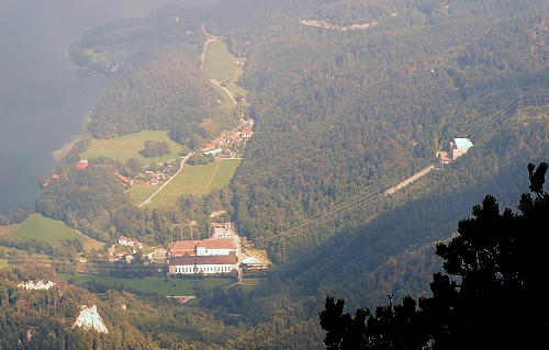 diesen Blick tief runter zu der Anlage. Links im Dunst sieht man den Kochelsee