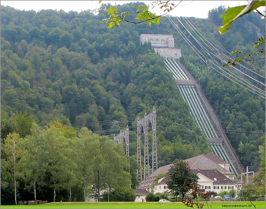 Das Bild hier oben zeigt die Turbinenhalle von außen. Ihr seht, dass die Druckrohre nicht schnurgerade in die Turbinenhalle hineinführen, sondern sie liegen neben ihr, bis das jeweils zu einer Turbine gehörende Rohr nach rechts zu dieser Turbine in die Halle abbiegt.