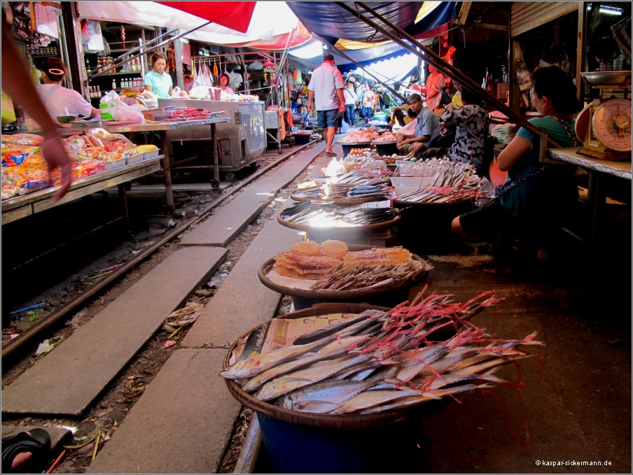 Und dann erlebt man, wie sich der Zug regelrecht seinen Weg bahnt, durch die Vororte von Bangkok und dann durch die Landschaft. Menschen, Büsche und Bäume scheinen ihm nur unwillig Platz zu machen. Wohl deshalb schaukelt er hin und her, vielleicht liegt das auch an den Gleisen. Die Fahrt dauert ziemlich genau eine Stunde und endet in Maha Chai. Wo das ist? Ganz einfach, es ist das Zentrum von Samut Sakhon. Etwa wie "Jungfernstieg" in Hamburg.